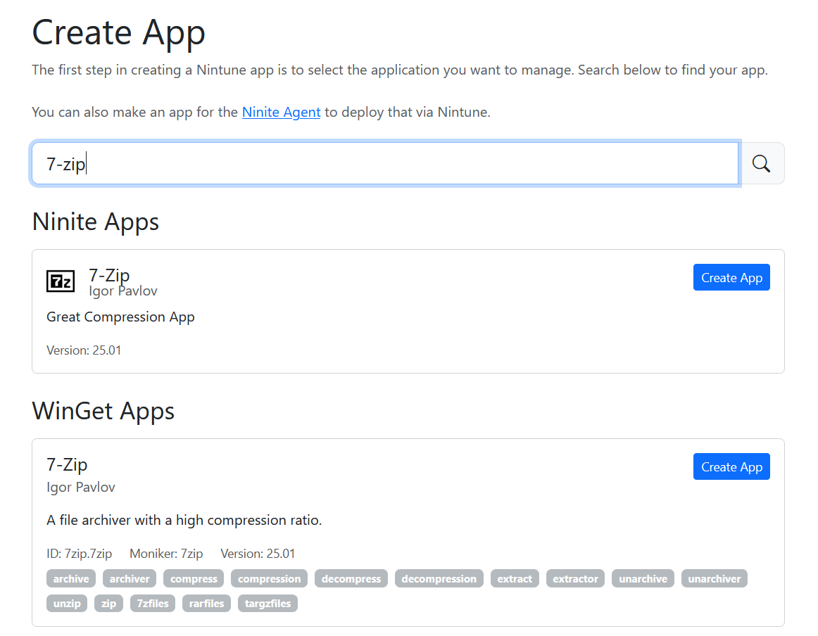 Winget without any Intune integration, the only deployment method is via Powershell (to find the commands, winstall.app is a good choice). Let’s use 7-Zip as an example for all of these, it’s one of the first apps I usually install on any new machine. We will cover custom repositories later.