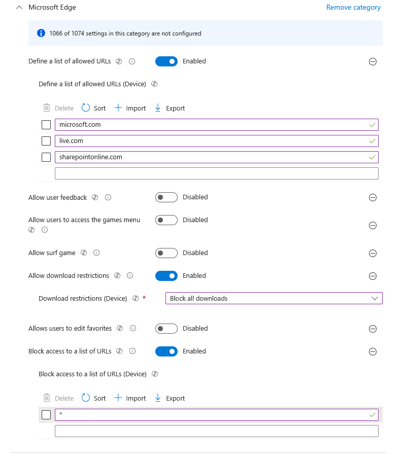We can complete this by using Assigned Access, some fancy parameters on Edge launch and a Settings Catalog policy to lock down the URLs.