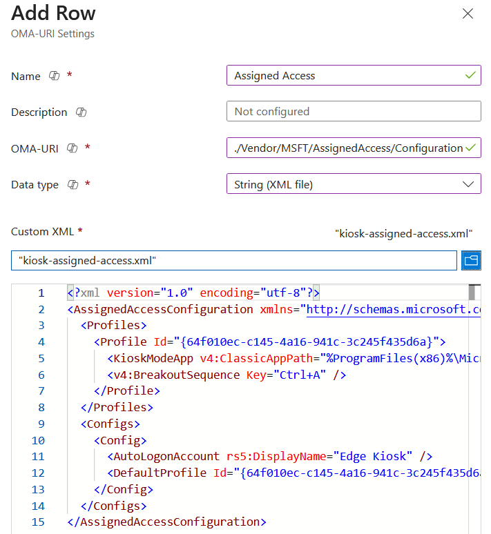 OMA-URI: ./Vendor/MSFT/AssignedAccess/Configuration